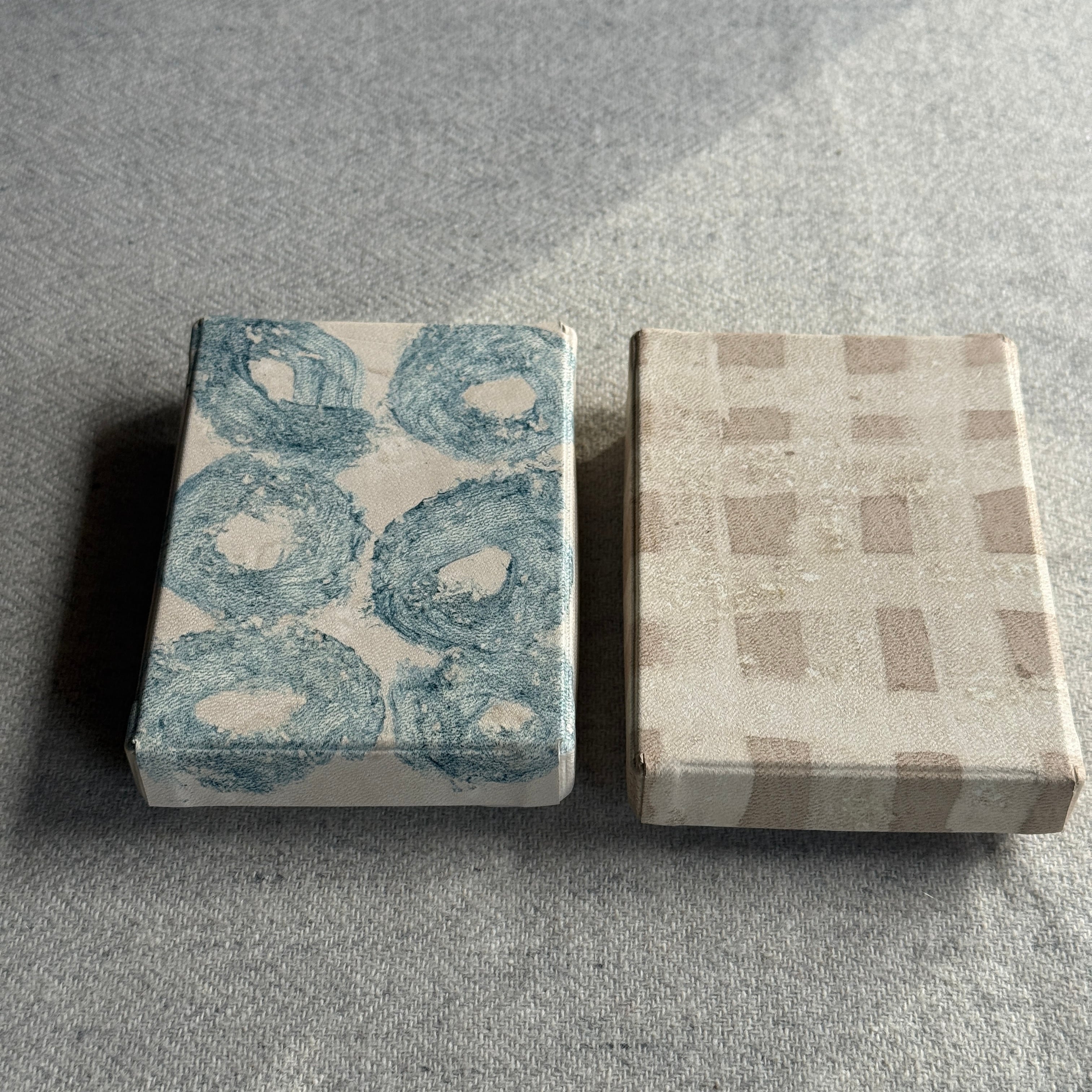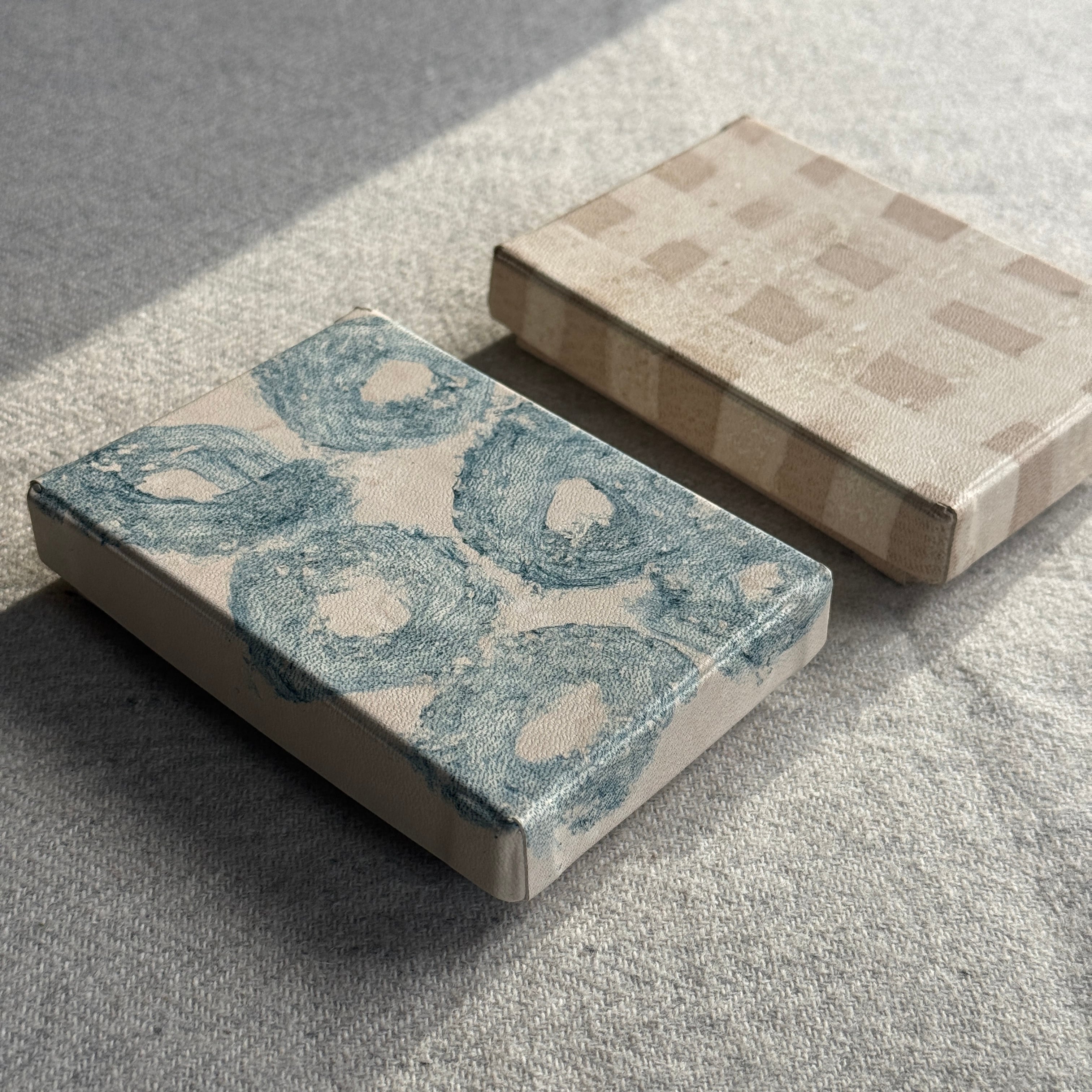 模様は季節ごとの花弁や、毎年種を継いで育てる藍の生葉を革に直接擦りつけることで描いています。