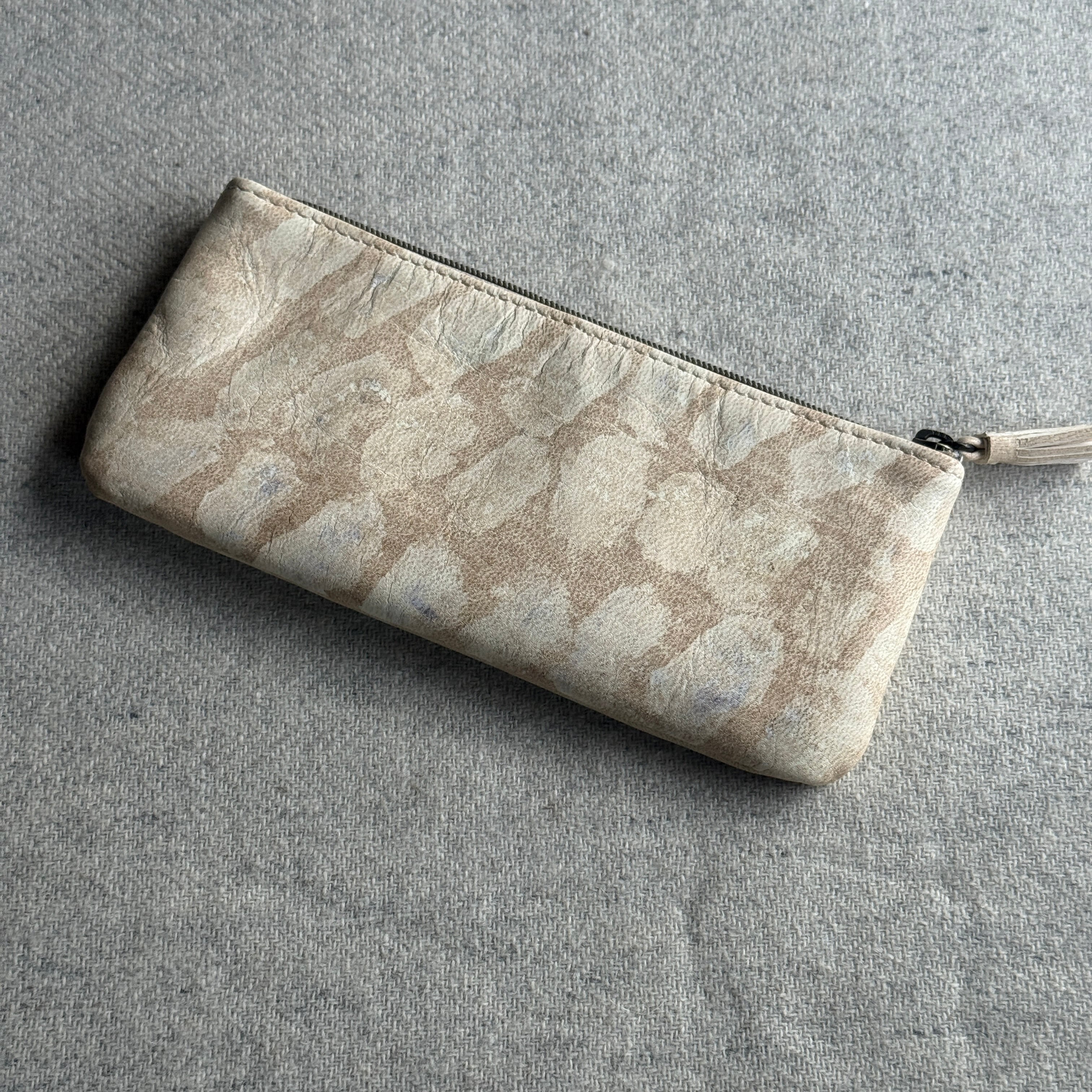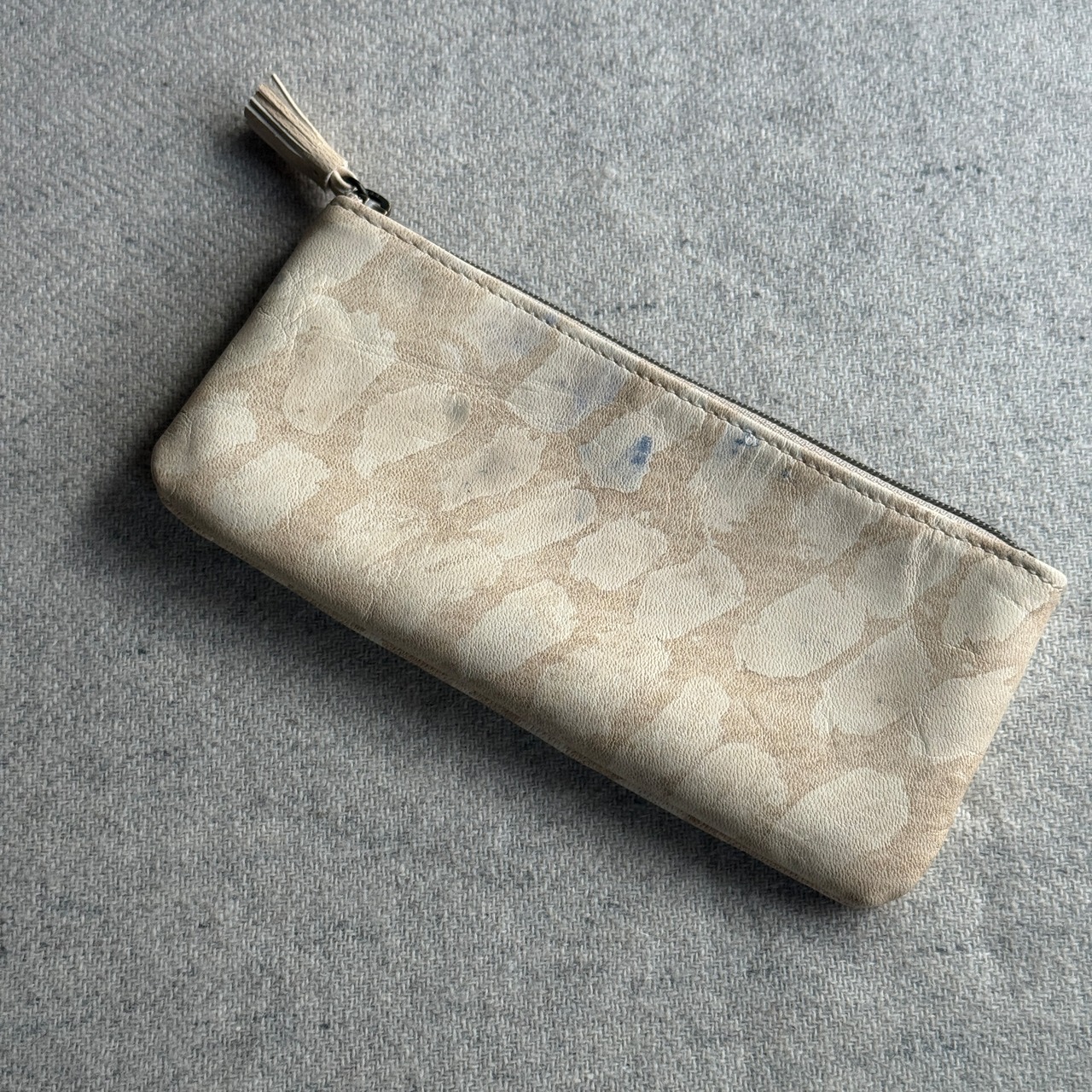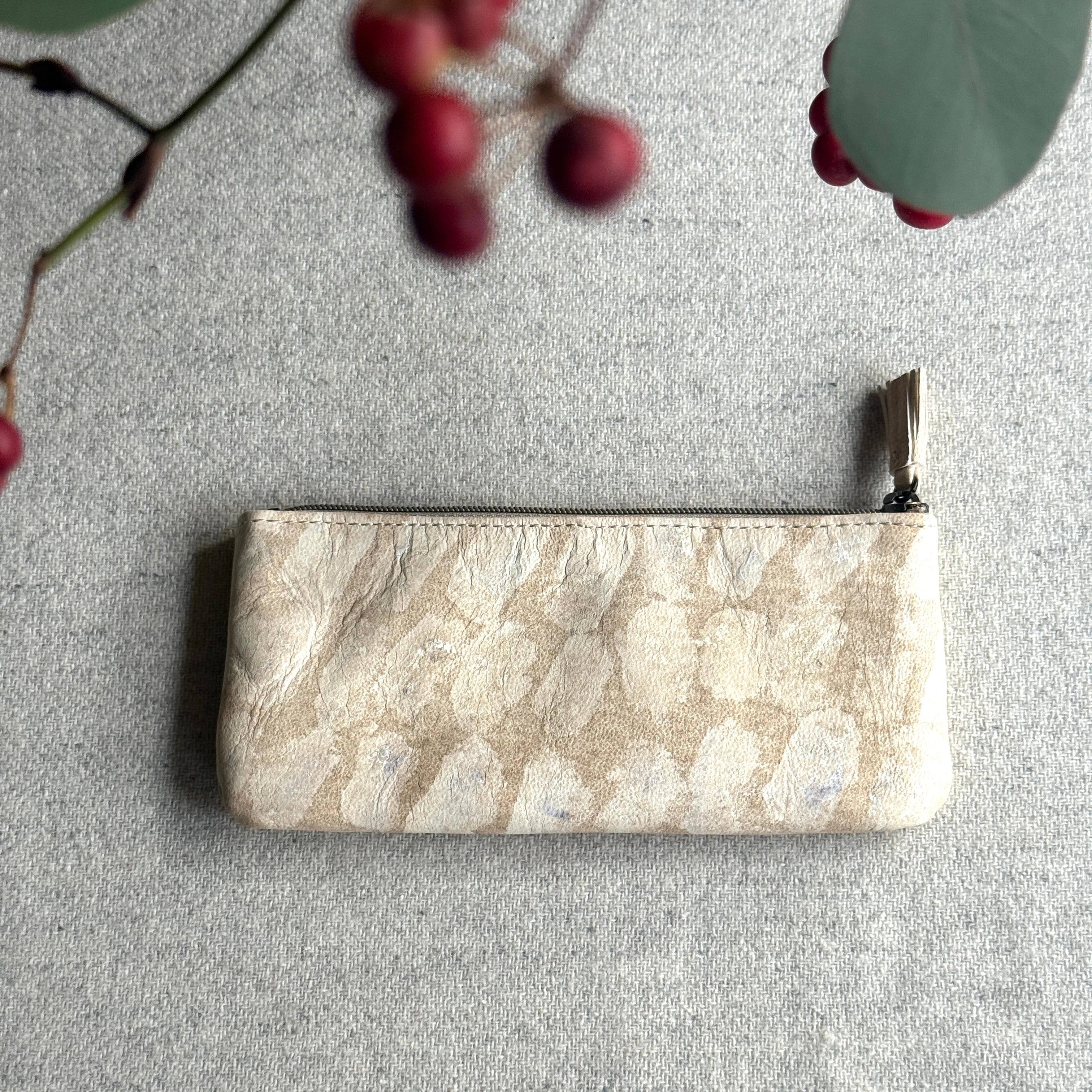 模様は季節ごとの花弁や、毎年種を継いで育てる藍の生葉を革に直接擦りつけることで描いています。